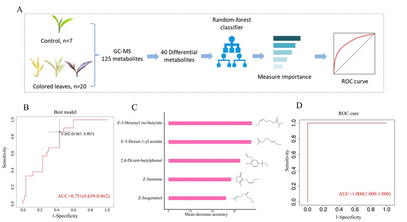 在这项研究中,作者以保存在taptap点点手机网页茶树种质资源圃的7个白化、9个黄化、4个紫化和7个正常(绿色)茶树种质为研究对象,利用顶空固相微萃取(HS-SPME)结合GC-MS技术分别对所选茶树种质芽叶的挥发性化合物进行了分析,共鉴定到125个香气代谢物。对异色茶树和绿色茶树的香气化合物分别进行比较,发现白化茶中上调的化合物最多,主要是以花果香为主的化合物,包括橙花醇、Z-异香叶醇和E-3-己烯醇乙酸酯等。紫化茶中下调的化合物最多,包括与清香和果香有关的β-月桂烯、苯甲醇和水杨酸甲酯等。根据VIP值和p-value,共筛选到40个差异化合物,其中在3个异色茶中共有的是Z-3-己烯醇、1壬醇、2,4-叔丁基苯酚和2,6,10,15-四甲基庚烷。利用这些差异代谢物构建的随机森林模型筛选出异丁酸叶醇酯、E-3-己烯-1-醇乙酸酯、2,4-二叔丁基苯酚、Z-茉莉酮和Z-异香叶醇等5个香气代谢物,通过本研究筛选到的香气生物标志物在一定程度上为判别茶树叶色提供了有价值的候选因子。