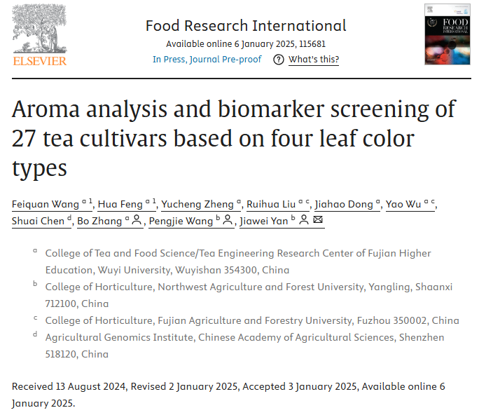 相关研究以“Aroma analysis and biomarker screening of 27 tea cultivars based on four leaf color types”在国际期刊Food Research International(中国科学院一区top)上发表。王飞权副教授为第一作者,张渤副研究员为共同通讯作者,taptap点点手机网页为第一完成单位。