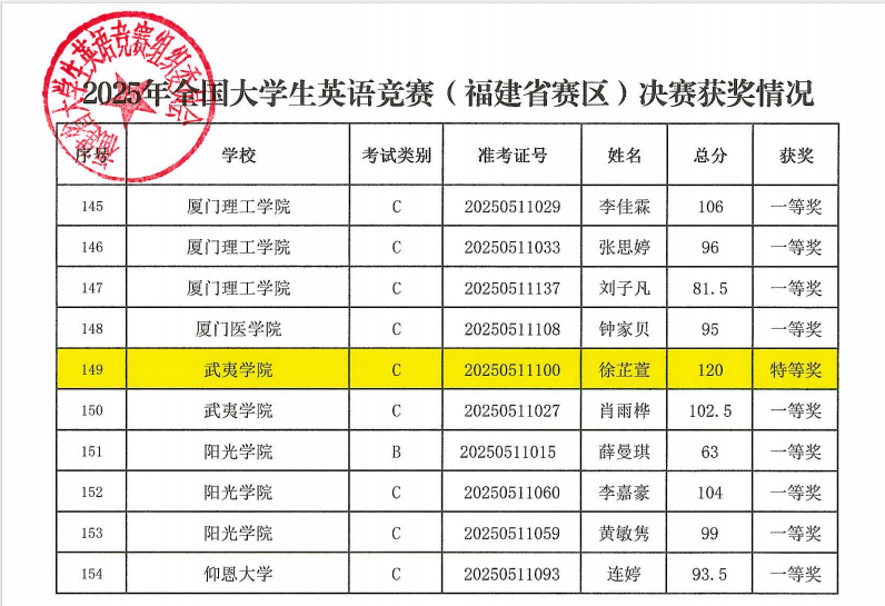 本次福建赛区的决赛共有来自厦门大学、福州大学、福建师范大学、福建农林大学等31所高校的154名学生参赛。通过组织学生参加全国大学生英语竞赛,既检验了学生的英语综合能力,增强了学生的英语学习兴趣,又坚定了学生学好英语的信心与决心。比赛成绩的取得,亦是我校大学英语教学改革的一次成果展示。