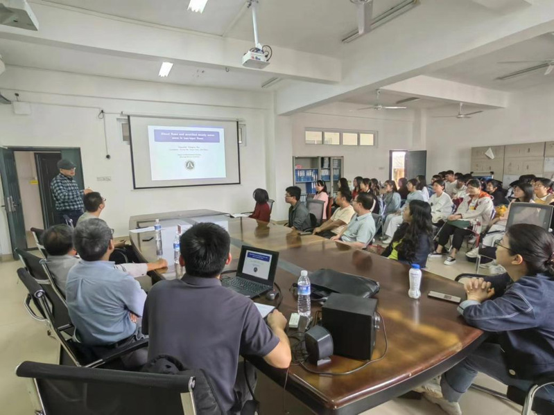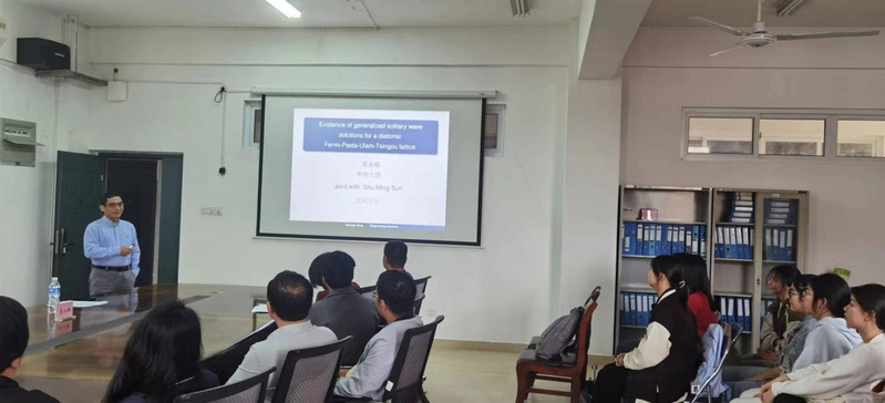 邓圣福教授作了题为《Existence of generalized solitary waves for a diatomic Fermi-Pasta-Ulam-Tsingou lattice》的学术报告。报告讨论了一类双原子Fermi-Pasta-Ulam-Tsingou(FPUT)晶格广义孤立波的存在性。运用动力系统方法以及Laurent级数展开的中心流形约简定理,将系统约简为一个五维常微分方程组,应用摄动方法证明原始动力系统同宿解存在,即FPUT晶格存在广义孤立波。告诉同学们复变函数在微分方程与动力系统研究中的重要作用。